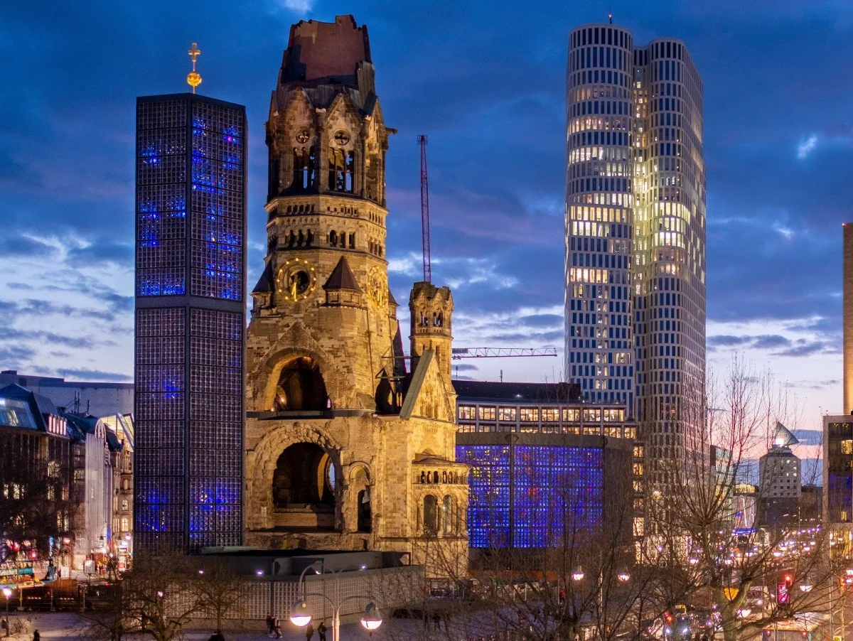 Die Kaiser-Wilhelm-Gedächtniskirche wurde bei den Luftangriffen auf Berlin beschädigt und sieht aus wie eine Ruine. Um die Schrecken des Krieges zu vermitteln, wurde die Kirche jedoch nur minimal restauriert. Es ist eine sehr wichtige Gedächtniskirche in Berlin, die von vielen Touristen besucht wird.